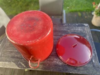 Grosse marmite vintage rouge bordeaux émaillée de 50 litres en super état. Un point de rouille dans le fond voir photo Hauteur 40 cm sans couvercle avec couvercle 47 cm Diamètre 4