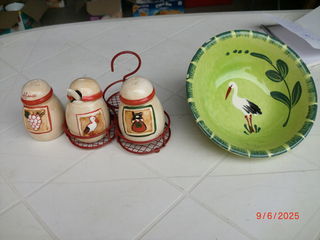 --1 bol Ø de 16 cm vert avec une cigogne neuf ; 2.5 euros - 1 service poivre -sel- moutarde avec la petite cuillère dans un panier ; 3 euros je fais des envois mais a votre ch