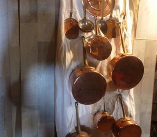 6 casseroles cuivre métaux ouvrés de vesoul ,+ 1 couvercle +ustensiles