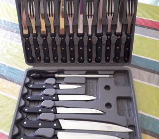 VEND: MALETTE COUTEAUX PLUS FOUCHETTES ET AFFUTEUSE JAMAIS SERVI INOX.