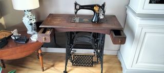 Machine à coudre ancienne à pédalier avec un coffre en bois, deux petits tiroirs, le mode d emploi d origine. Les pieds sont en fonte couleur noir.