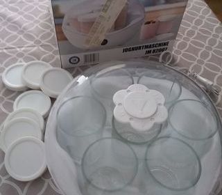 Yaourtière très simple, 7 pots en verre (2 fêlés mais utilisables sans problème), 7 couvercles, aucun envoi, à venir chercher sur Préfailles, paiement uniquement en espèces