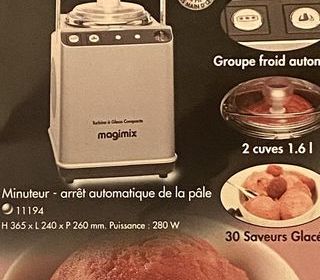 Glaces ou sorbets "maison", Turbine à glace haut de gamme, MAGIMIX type 11194 comme neuve, Utilisée 2 fois, cuve réfrigérée, Pour faire de super glaces en 20 mn.