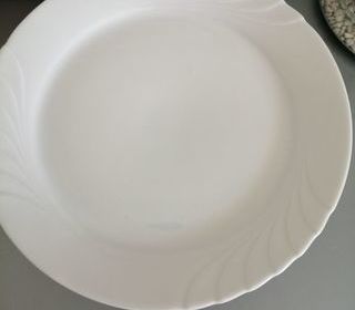 6 belles assiettes porcelaines blanches comme neuves diamètre s 25,5cm va au lave vaisselle sans problème.