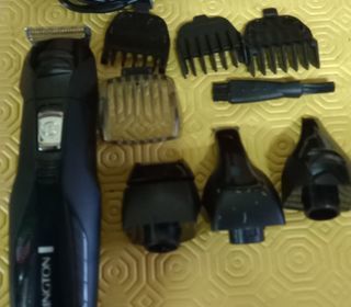 Tondeuse électrique Remington avec plusieurs sabots de coupe, têtes interchangeables, brosse de nettoyage et chargeur secteur. L'ensemble est complet selon la photo. État neuf
