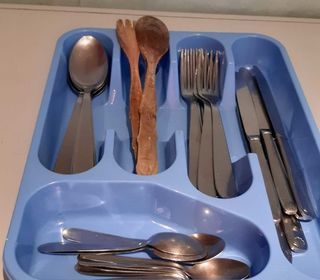6 petite cuillères 6 cuillères a soupe 6 couteaux 6 fourchettes 1 set de couverts bois 1 range couverts bleu