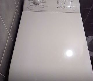 Lave-linge top blanc de marque Faure, avec panneau de commandes en façade et ouverture par le dessus. Bon état apparent, tous les boutons présents. Marquages des différents program
