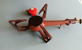 Réchaud tripattes et détendeur Réchaud en fonte et laiton DECOTEC tripattes 1 feu butane et propane Pour conserves et confitures Poids 3 kg, longueur 48 cm, largeur 30 cm Dét