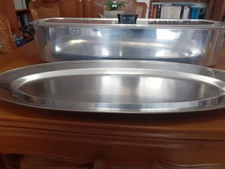 VDS Ensemble POISSONNIERE & PLAT : TBE Poissonnière Alu. L :60cm H :12cm l :18cm TBE. Plat Oval : Guy DEGRENNE 18/10 Acier Inox . Couleur Argent L :60cmX27cm Le tout servi 2