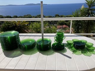 Vaisselle en verre, verte. Assiettes plates Assiettes creuses Assiettes à dessert Tasses et sous-tasses petit déjeuner Tasses et sous-tasses à café Très bon état A retirer s