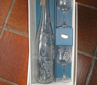 Ensemble de 2 verres a pieds et bouteille gravés de grappes de raisins"gravure main certifié par étiquette,ensemble neuf dans son carton d'origine,livraison possible a Paris