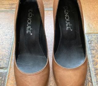Marque Dénouée, chaussures en cuir marron. portées uniquement à la maison, pour tenter de marcher avec des talons haut, mais ce n'est pas pour moi. Taille 36, plutôt pour pied fi