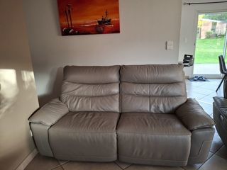 Canapé cuir 3 places électrique couleur taupe gris Canapé :L. 203 x H 98/104 x P. 98 cm 2 relax +2 têtières réglables électriques Prises USB de chaque côté Très bon état Possi