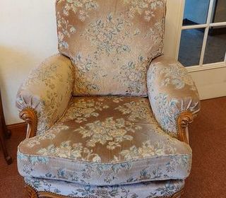 Lot de 2 fauteuils velours, style Louis XV, motifs floraux, dimensions en cm: 88(l) x 100(h) x 90(p). Disponible également 1 canapé 3 places de même modèle. A venir chercher