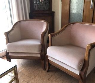 Je vends 2 fauteuils. merisier et velours rose en bon état
