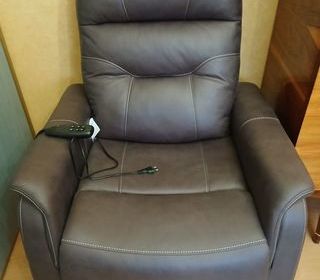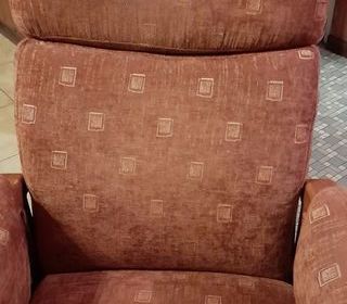 Fauteuil électrique, couleur brique avec petit motifs plus clair, accoudoir bois recouvert de tissu armature bois. Petit trou au niveau de l'assise à voir sur la 3ème photo, le fa