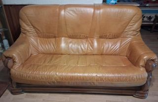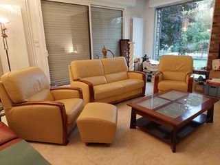 vends salon en cuir montant en bois 3 places et deux fauteuils donne table basse