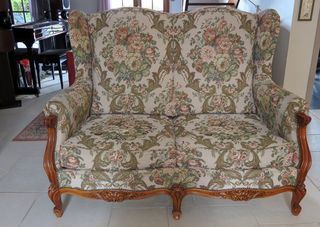 Canapé 2 places et son fauteuil assorti Tapisserie et bois teinte merisier style Louis XV Le tissu est à rafraîchir mais la partie bois est en parfait état L 140 H 110 l 90 T