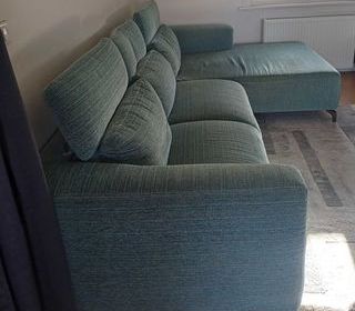 Canapé 3 places fixe couleur gris bleu avec méridienne un fauteuil avec pouf et 2 coussins assortis le tout en très bon état et actuellement dans un salon non fumeur pas de livrais