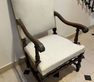 Je vends ce fauteuil Louis XII Louis XIV nouvellement refait, avec sa structure en bois travaillé et son assise recouverte d'un tissu blanc crème. Un meuble de caractère idéal pour