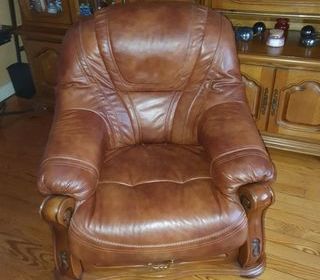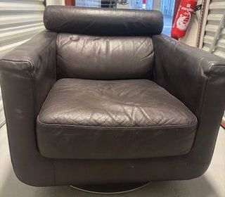 Ensemble composé d?un canapé trois places et d?un fauteuil assorti en revêtement foncé, avec accoudoirs et dossiers rembourrés. Présentent des signes d?usure visibles.