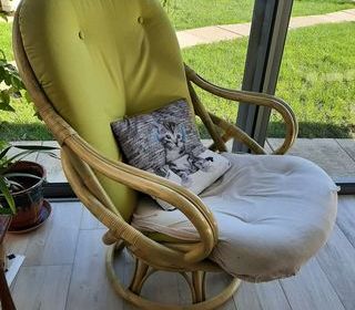 Fauteuil à bascules en parfait état, très peu utilisé Assise plutôt ferme, repose-pieds, petite pochette à droite pour glisser des revues Noir et blanc, motif pieds de poules Ha