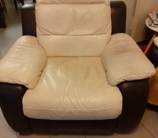 vend petit prix un fauteuil relax manuel en cuir de chez cuircenter blanc et marron tétière réglable assise confortable bon état à venir chercher pas de livraison .