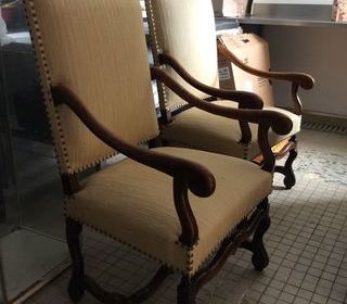 Disponible un fauteuil de style LOUIS XIII en hètre , pietement dit os de mouton avec une entretoise joliment tapissés de couleur beige chinée. Petite tache. Très bon état, bon