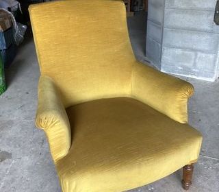 Fauteuil ancien en tissu jaune doré ,très confortable, bonne assise. Dimensions hors tout : Ht 88, largeur 75, profondeur 75 cm . En bon état À remettre en mains propres. Tel.