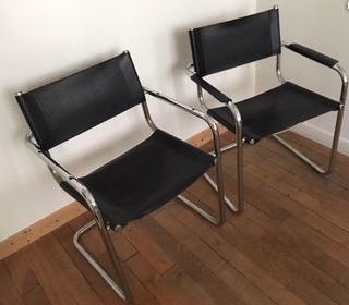 Fauteuil de bureau style BAUHAUS B34 Marcel Breuer Assise et dossier en simili cuir tendu, structure en acier tubulaire chromé à€ rénover. Hauteur : 77,5 cm Largeur : 55 cm