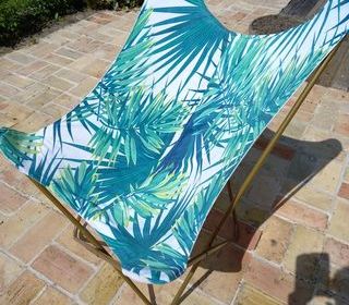 Fauteuil "papillon" en coton coloris jungle état neuf avec pied en métal de couleur doré qui donne de l'élégance. Facile à démonter pour le ranger. Dimension: 67x85x100cm.