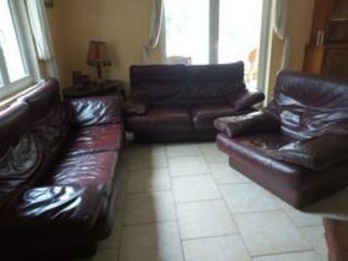 Salon 3 pièces: un fauteuil 1 p., un divan 2p. et un divan 3p. Couleur bordeau.