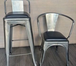 Environ 100 chaises "fauteuil" et 20 tabourets "fauteuil" TOLIX en acier finition brut verni brillant avec assise à vendre. Les chaises et tabourets sont en bon état. Prix d