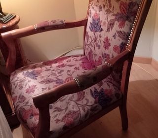 Fauteuil style louis XV. Structure en bois sculpté. Pieds galbés. Accotoirs dits en coup de fouet. Dossier incurvé et enveloppant , tissu motif floral. En bon état.