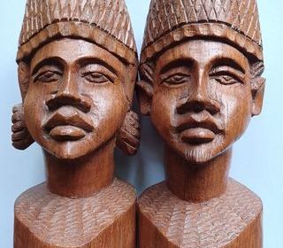 Lot 2 statuettes / bibelots d'artisanat africain en bois sculpté - Homme & Femme - 16 cm - Très bon état· Chaque statue possède un socle taillé, sculpté de forme ovale et légèreme