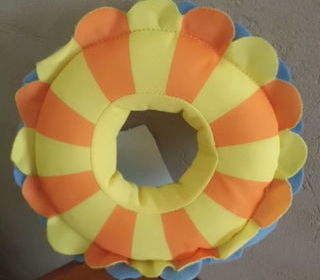 hochet jaune et orange en tissu jersey l'autre face est bleu grelot a l'interieur 14 cm de diametre marque fisher price annee 2014 tres bon etat envoi rapide ref 417