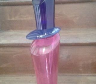 Rose le flacon, violet le bouchon sur le modèle du parfum. Très correct. Un peu de poudre au fond, mais je n'arrive pas à l'ouvrir. Rose un peu abimé par endroit.