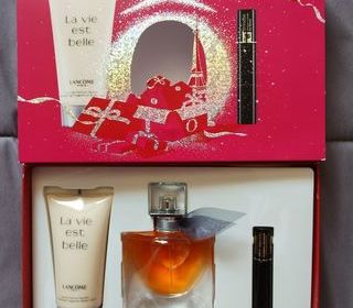 Coffret Lancôme comprenant un flacon de parfum EDT 30ml La Vie Est Belle, un tube de lait parfumé pour le corps 50ml et un mascara hypnose 01 Noir hypnotic 2ml. Les articles sont p