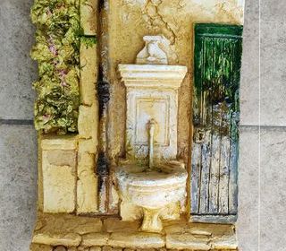 Vends cette décoration murale en relief à suspendre : - Modèle : Fontaine accompagnée de fleurs roses. - Sculpture signée par "Reliefs". Signature inscrite sur la tranche basse.