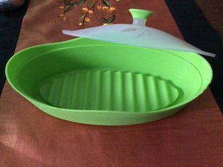 papillote en silicone pour four, micro ondes,congélateur longueur 24cm largeur 12cm profondeur 4cm légèrement abîmé sur le bord( voir photo) mais ne gêne en rien la cuisson