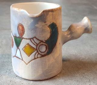 Petit pichet crémier en céramique signé Marie-Christine Treinen, production française années 60 - 70. Décor géométrique stylisé légèrement en relief, émaux sur fond beige et bleu c