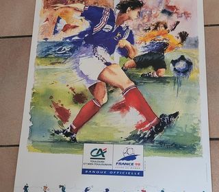 AFFICHE COUPE DU MONDE 98. JOUEUR EN ACTION DEVANT LE BUT. ÉTAT IMPECCABLE, SERA DU PLUS GRAND EFFET SOUS VERRE POUR COLLECTIONNEURS OU AMATEURS DE L'ÉQUIPE DE FRANCE 98 DIMENSI