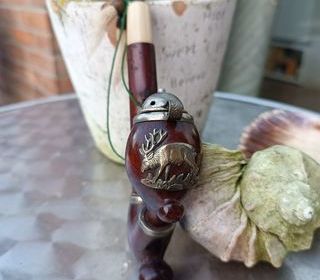 Pipe de chasse ancienne bavaroise ou tyrolienne (" Jagd-Pfeife " / " Jagdpfeife "). Matériau du foyer : Bruyère (bois de racine de bruyère). Inscription : " BRUYÈRE GARANTIE " ? co