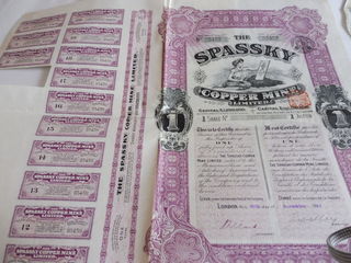 2 EMPRUNTS RUSSES Charbonnages d'Ekatherine action de 100 francs - 2 OBLIGATIONS BAHIA (Brésil ) obligation de 500 francs - 1 ACTION SPASSKY Copper mine Tous en très bon état