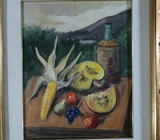 Tableau ECOLE FRANCAISE (XXème) Nature morte aux fruits et à la bouteille Huile sur papier 38 x 49 cm