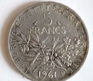 Millésime 1961. Diamètre 29 mm. Poids 12 g. Gravé par L.O. Roty. Tranche en relief. Il est à noter que cette pièce fut en circulation. Merci aux collectionneuses et aux co