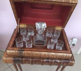 Après succession , vends cette rare cave à liqueur en trompe-l'oeil simulant cinq livres reliés cuir doré (Les Misérables , etc . ..) et découvrant une carafe en cristal taillé Bac