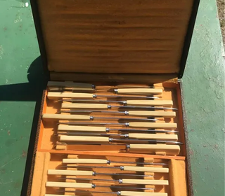 Boîte de 24 couteaux anciens Marque : AC-France ? 12 couteaux grand modèle ? 12 couteaux petit modèle Manches en Bakélite blanche Lames en acier inoxydable Prix : 25 euro