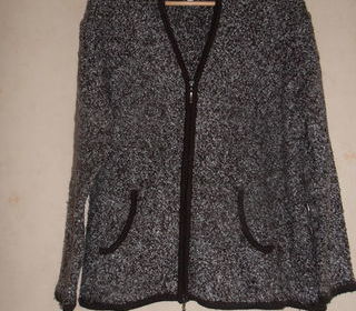 Très belle veste chinée marron et beige, col montant, fermeture éclair en métal argenté avec pampilles argentées à chaque extrémité, manches longues, 2 poches en biais devant,