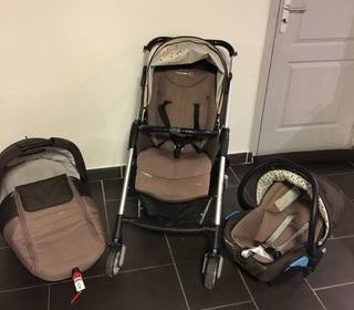 Poussette Peg Perego Trio complète, propre et en bon état. Poussette + Nacelle XL et surmatelas + support bassinet pour nacelle et cosy + cosy + habillage pluie. Le prix comprend
